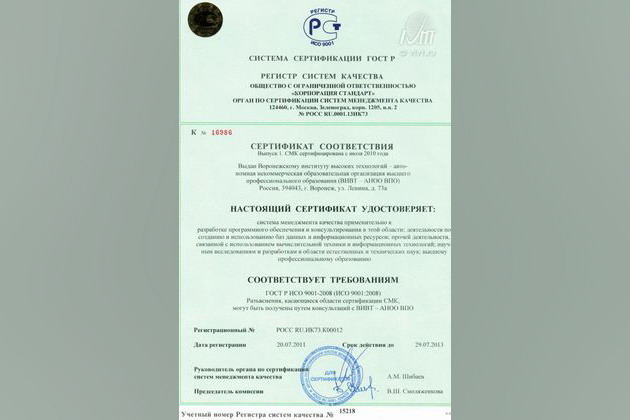 Воронежский институт высоких технологий получил сертификат соответствия системы менеджмента качества международного стандарта ISO 9001:2008.