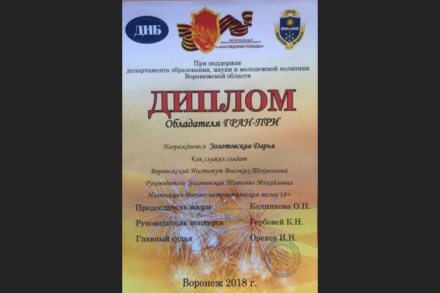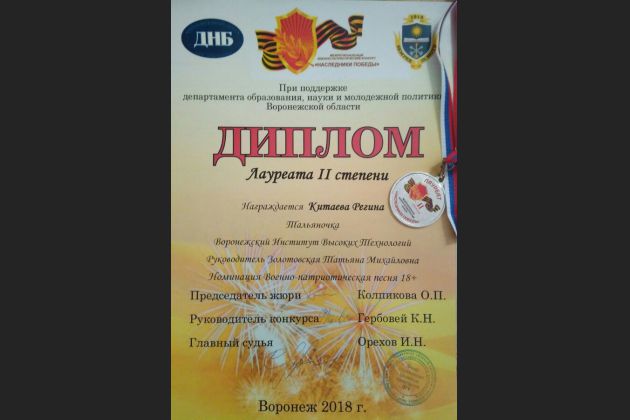 Воронежский институт высоких технологий представили Регина Китаева и Дарья Золотовская. Дарья стала обладательницей гран-при конкурса, а Регина - лауреатом 2 степени.