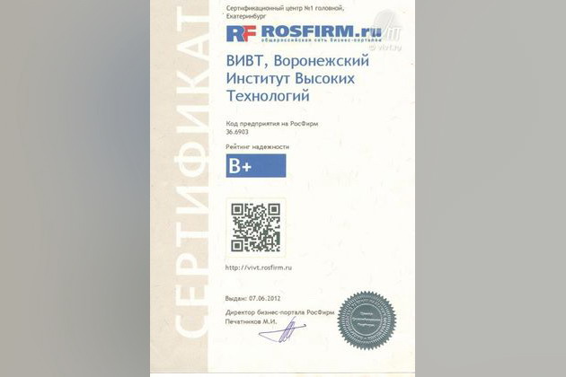 7 июня 2012 года Воронежскому Институту Высоких Технологий был присвоен рейтинг надежности общероссийской сети бизнес-порталов ROSFIRM.ru «В+». Это универсальный инструмент оценки надежности компаний, основанный на ее репутации , достижениях и совокупности показателей качества работы.