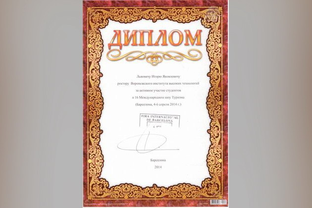 ВИВТ награжден дипломом за активное участие студентов в 16 международном шоу Туризма, который проходил с 4 по 6 апреля 2014 года в Барселоне.