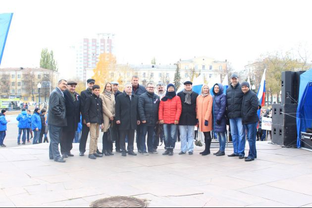 4 ноября на Советской площади Воронежа состоялся традиционный митинг-концерт, приуроченный ко Дню народного единства. На праздничное мероприятие прибывали поодиночке и целыми коллективами, дружными компаниями и семьями, с детьми, бабушками и дедушками. К началу акции, которая стартовала в 11 часов, у здания Воронежского городского концертного зала собралось около шести тысяч человек. На митинг пришли как первые лица региона и города, так и представители трудовых коллективов, профсоюзов, общественных организаций, партий, молодежных объединений, депутатского корпуса. Так же данное мероприятие посетили студенты ВИВТ и волонтеры Центр гражданской взаимопомощи в Воронеже Открыли митинг минутой молчания, почтив память погибших в авиакатастрофе самолета «Airbus-321» рейса 9268 «Шарм-эль-Шейх – Санкт-Петербург». Жители региона вышли на митинг с разными лозунгами, но один стал объединяющим - «Мы вместе». Об этом же говорили и выступавшие со сцены известные в Воронеже люди. К собравшимся на площади обратились представители национальных общин, Молодежного парламента, Общественной палаты, духовенства. Все выступающие говорили о том, что в единстве народа и его верности своим традициям - наша сила и уверенность в завтрашнем дне. Руководитель ВРОО «Молодое Черноземье» Валерий Черников, поздравив присутствующих с праздником, отметил, что этот день объединил людей разных народностей, занятий, возрастов. «Мы чувствуем себя единым народом, сильным, самодостаточным государством. Это дает нам уверенность в будущем дне, в том, что нашу страну победить невозможно», - подчеркнул Валерий Черников. А член Молодежного парламента Воронежской области Алина Базарова отметила: «Мы все – разные, у нас у каждого есть свои взгляды. Но мы должны понимать, что единство нашей страны – это залог нашего будущего». Проректор Воронежского государственного университета, сопредседатель регионального отделения Общероссийского Народного Фронта Василий Попов предложил не забывать о своей истории. «Всех нас объединяют чувства гордости за свою страну, за ее славную историю и свершения многих наших предков. Современная Россия сильна прежде всего благодаря огромному потенциалу людей, искренне желающих принести пользу своему Отечеств. А наш единый многонациональный народ является главной его опорой», - подчеркнул Василий Попов. Официальные поздравления чередовались с выступлениями творческих коллективов Воронежа. Собравшуюся на Советской площади многотысячную публику приветствовали артисты Воронежской филармонии, казаки, ведомственные коллективы.