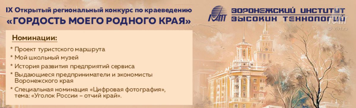Подведены итоги заочного этапа Открытого межрегионального конкурса по краеведению «Гордость моего родного края». Конкурс учрежден в 2008 году Воронежским институтом высоких технологий c целью создания благоприятных условий для развития у детей творческих и интеллектуальных способностей, интереса к научно-исследовательской деятельности; создания необходимых условий для поддержки одаренных детей; повышения интереса к различным видам туристско-краеведческой деятельности.